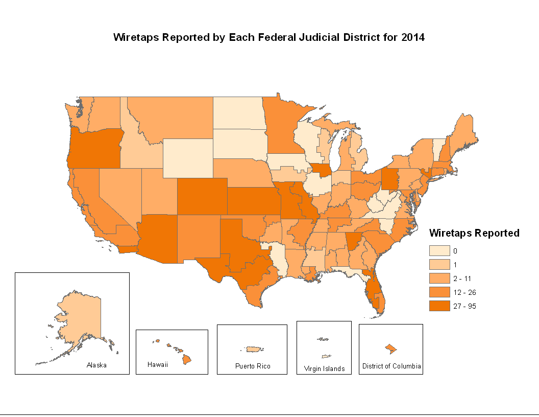 In 25 states, a total of 141 separate local jurisdictions (including counties, cities, and judicial districts) reported wiretap applications for 2014. Applications in California accounted for 43 percent of all applications approved by state judges. Seventy-eight federal jurisdictions submitted reports for 2014. The District of Arizona authorized the most federal wiretaps, approximately 7 percent of the applications approved by federal judges.